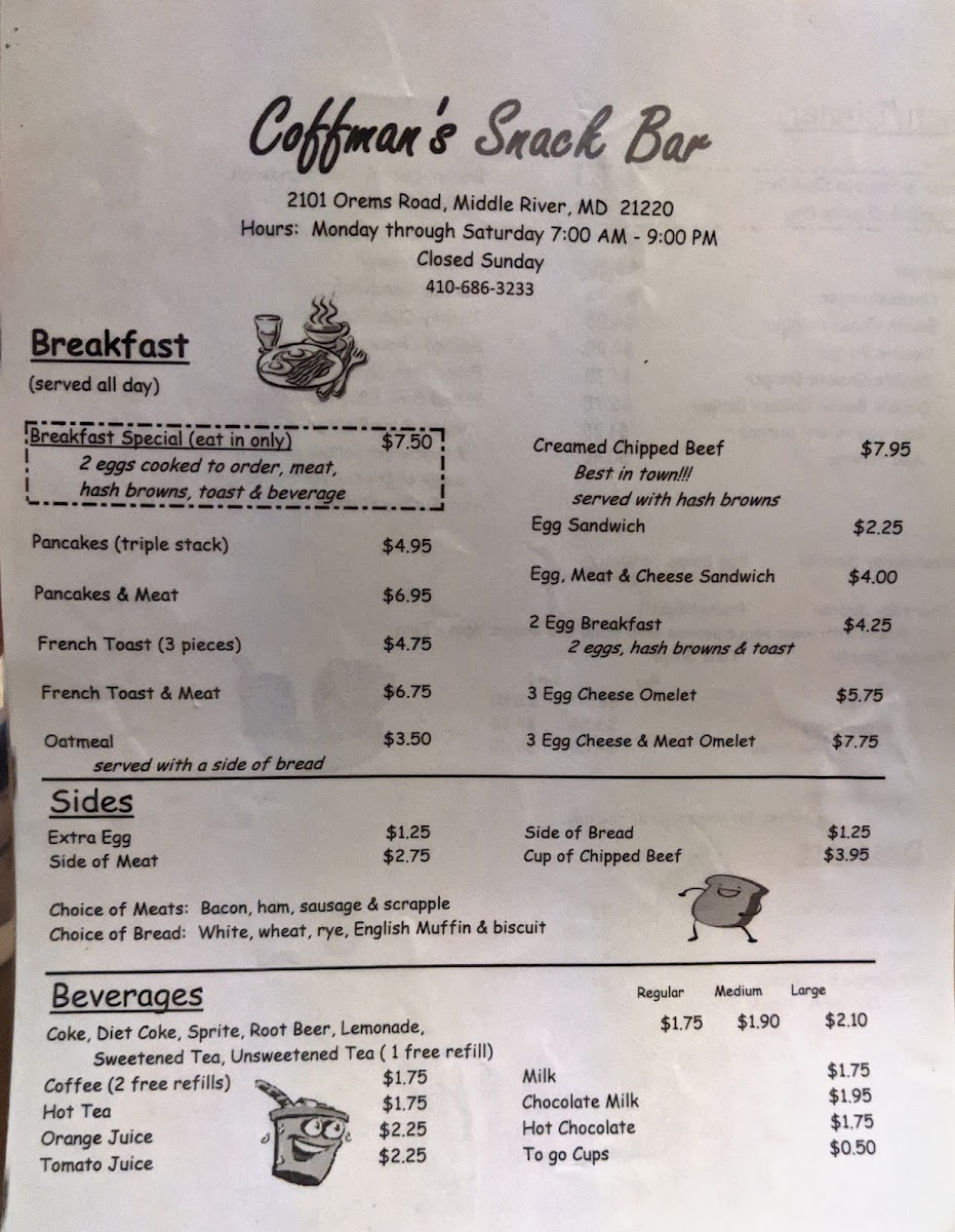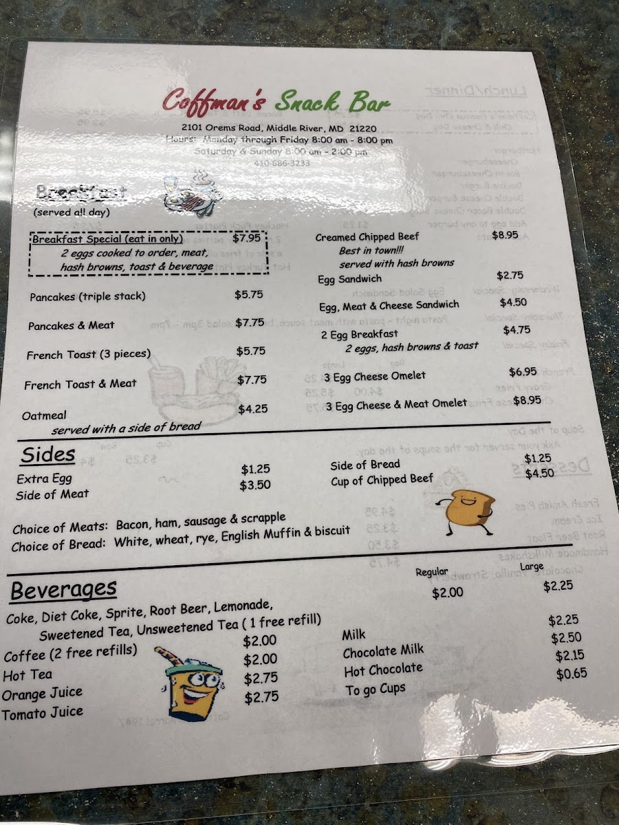 Welcome to Coffman's Snack Bar, a beloved local gem nestled in Middle River, Maryland. Offering a nostalgic vibe and a menu full of hearty options, it’s the perfect spot for breakfast or lunch. Dive into our breakfast specials, where fluffy Pancakes and savory 3 Egg Cheese Omelets set the tone for a great day. For lunch or dinner, enjoy classic choices like a mouthwatering Turkey Club Sandwich or a crispy BLT, which have garnered rave reviews from satisfied customers.